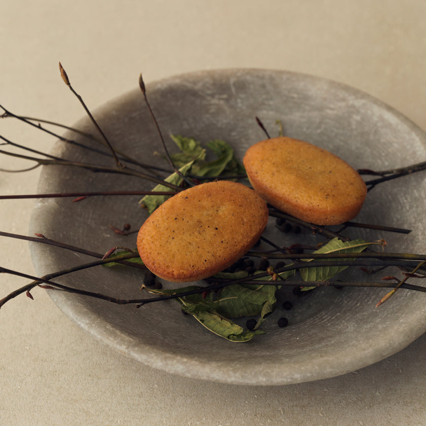 「武夷岩茶(ぶいがんちゃ)」のもつ独特の香ばしい香りと奥深い甘さを感じられるフレーバー。中国・福建省北部にあり、世界自然文化遺産でもある武夷山で取れる武夷岩茶は、ミネラル感があり、独特の香ばしさが特徴。武夷岩茶の香りはフィナンシェとの相性がとても良く、より奥行きのあるスパイシーな香りへと引き上げてくれます。焦がしバター、アーモンドに武夷岩茶のキャラメルを加えることで、ここにしかない深い味わいに仕立てました。